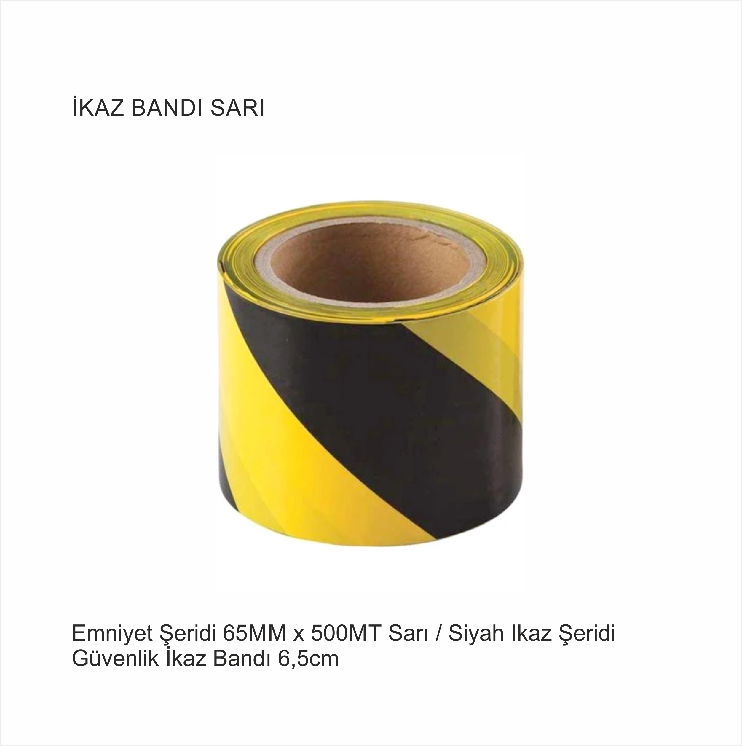 Sarı Siyah Renkli İkaz şeridi. 6.5cm genişliğinde, 500metre uzunluğunda. Özel hammaddeden üretilen sarı siyah renkte, boyası çıkmayan emniyet ikaz bandıdır. Özel alanların belirlenmesi, şerit çekilmesi, sınır konulması, engellerin ve tehlikeli alanların işaretlenmesi vb. amaçlarla kullanılabilir.